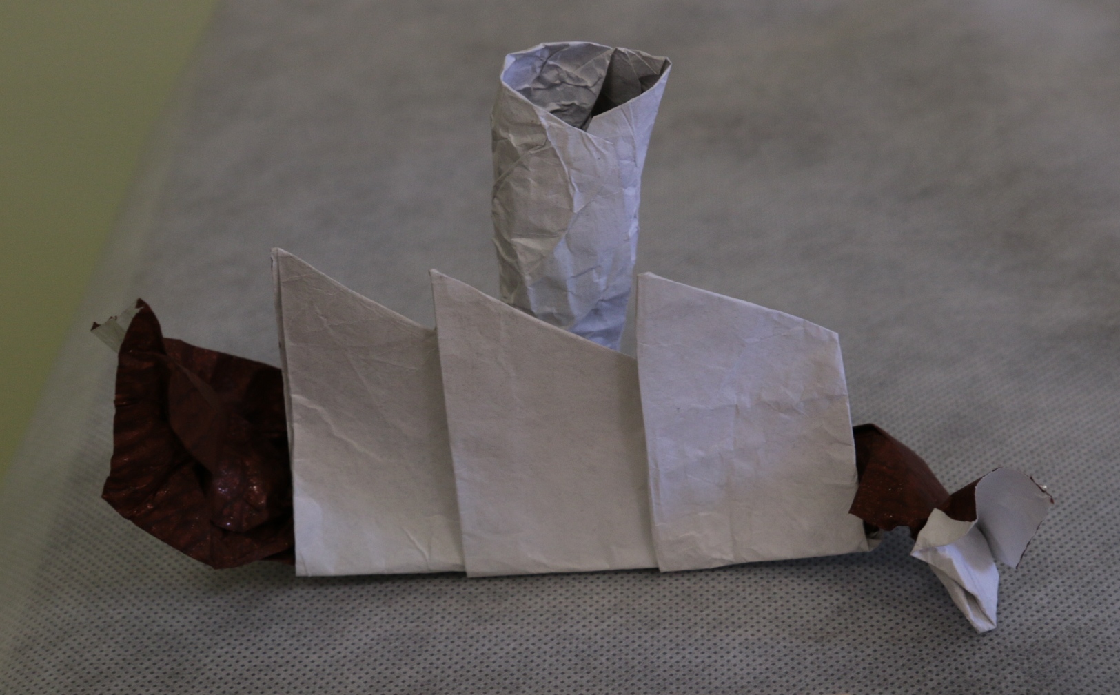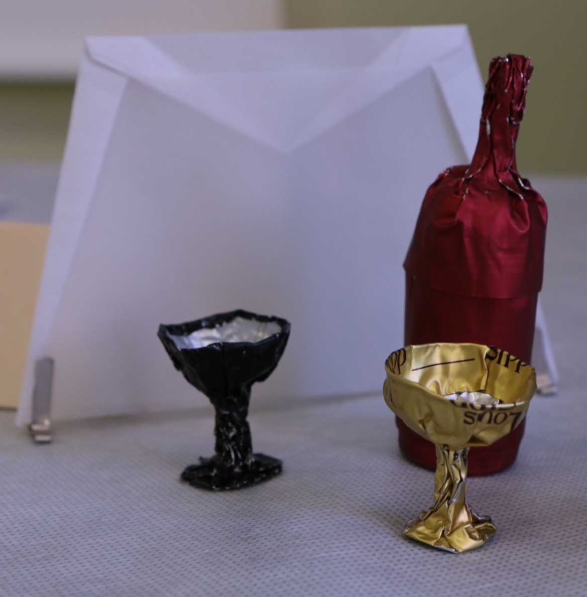 Papier calque A5 (pliage : Mveloppe) et collerettes de bouteilles (froissage : verres et bouteille)