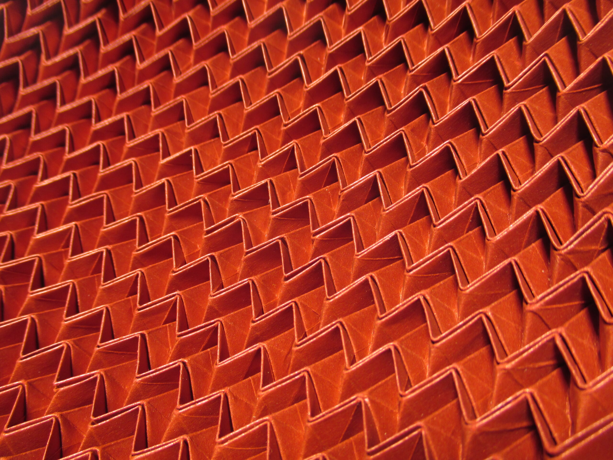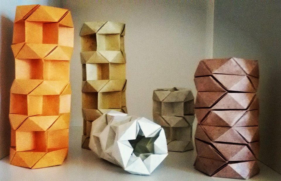 Most of her geometric works were invented empirically by playing with geometry and patterns. Since they are designed instinctively, without taking into account any geometric rule, they often have internal tension that make their collapse particularly tricky and fun.